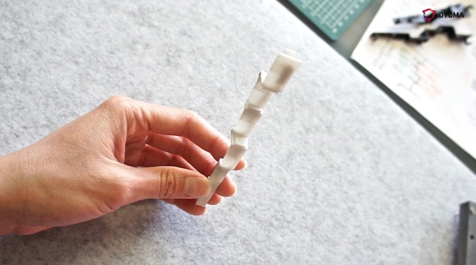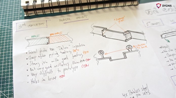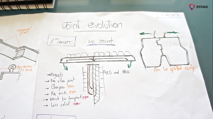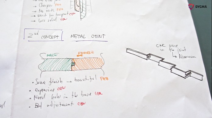 This was a cool concept for us. We used a technical plastic, POM, also called Delrin, to create the joint. It was a Japanese joint: a male and female joint with a widening shape that had more optimal surface contact.